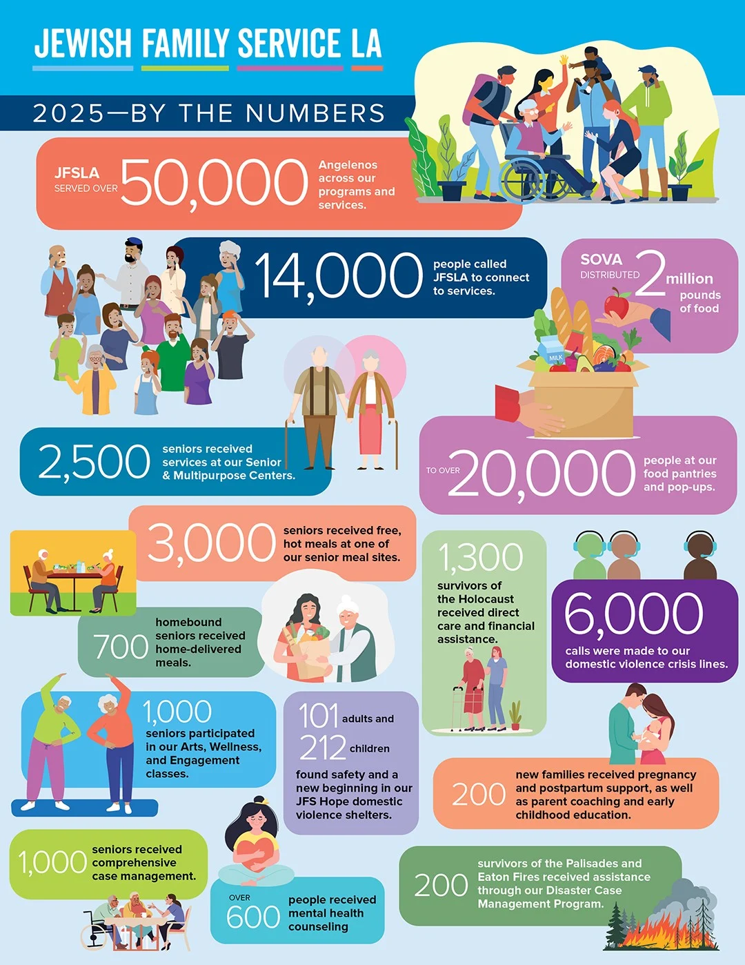 In 2025, JFSLA supported individuals and families across our community through a wide range of essential programs and services. This impact report highlights the number of people served through each program area, reflecting our continued commitment to meeting urgent needs, strengthening stability, and promoting long-term well-being. From food assistance and case management support to mental health services, domestic violence assistance, aging support, Holocaust survivor care, and family-focused programs, these numbers represent real people whose lives were touched by JFSLA’s work throughout the year.