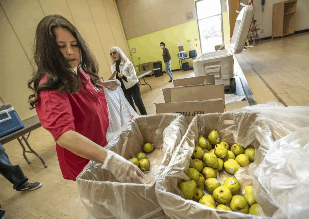 At VIC’s Sherman Oaks center Monday morning, 15 people had already signed up for the day’s food pantry offerings. In the multipurpose room, where a free lunch was being prepared, Larry Fazio called out bingo numbers for early arrivals. I then followed him over to the pantry, where he helped set up boxes of apples, bananas, potatoes and other basics.