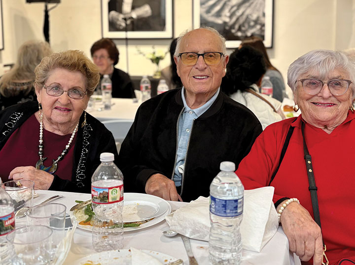 On Feb. 11, a luncheon was held at Jewish Family Service LA’s (JFSLA) Café Europa that featured “Borrowed Spotlight,” a photography exhibition and book dedicated to sharing Holocaust survivor stories. The portrait series, created to combat rising antisemitism and preserve Holocaust history, was captured by fashion photographer Bryce Thompson. It pairs Holocaust survivors with today’s most recognizable figures – including Cindy Crawford, Jennifer Garner, Billy Porter and David Schwimmer – using their public platforms to amplify the survivors’ stories. The exhibition features large-scale portraits of Holocaust survivors posing alongside A-list celebrities along with the survivors’ testimonies.Maria Ross and Arnold and Jeanetta Perl at the “Borrowed Spotlight” luncheon honoring Holocaust survivors from JFSLA’s Cafe Europa. Courtesy of Jewish Family Service LA